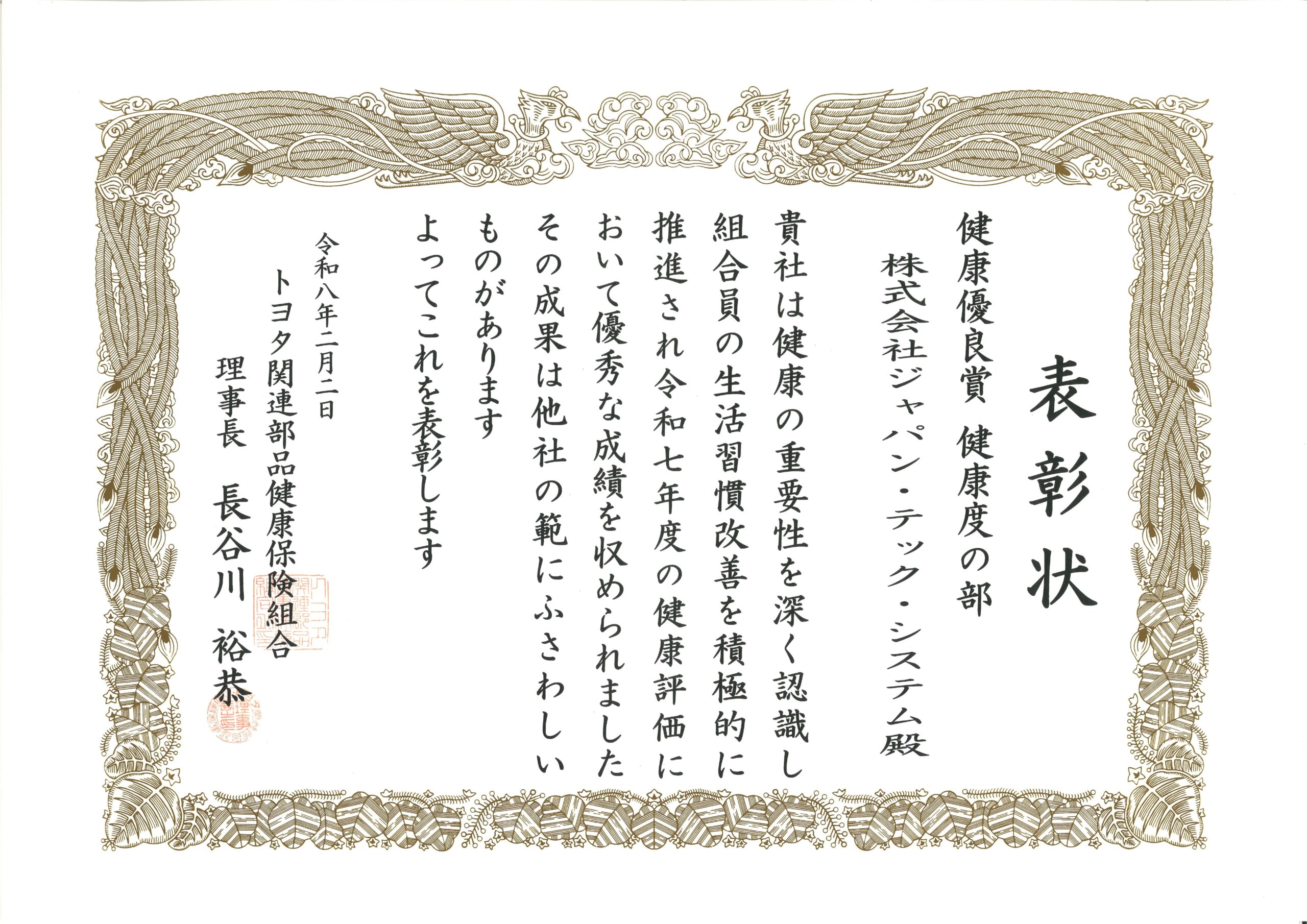 当社は、加入しているトヨタ関連部品健康保険組合から「健康優良賞(健康度の部)」を受賞しました👏👏 こちらは、2025年度の定期健康診断・人間ドックの結果が高く評価されたものになります。 JTSでは、健康を大切にする社風のもと、従業員が安心して働ける環境づくりを進めています。 この表彰状も私たちの健康への取り組みを象徴する一枚ですね😄👍️